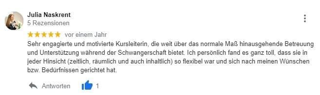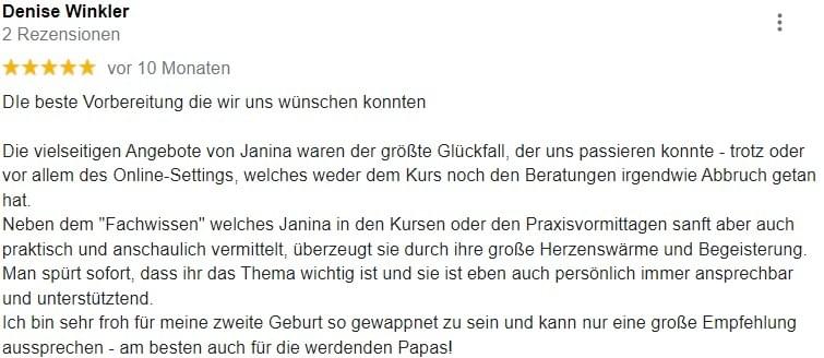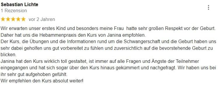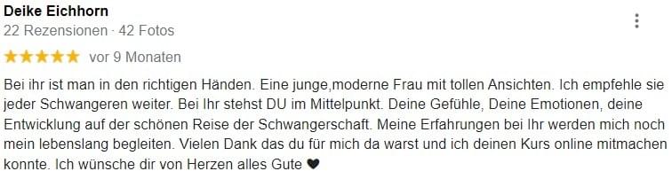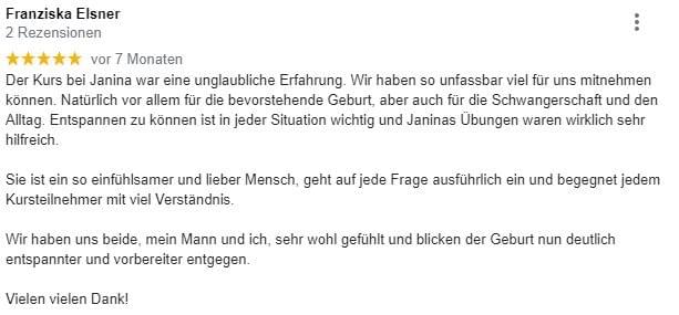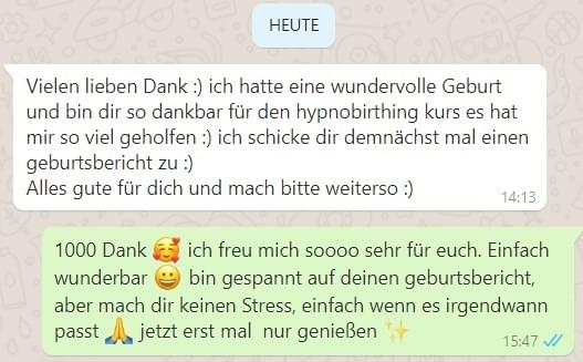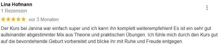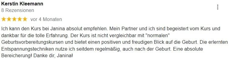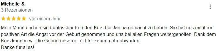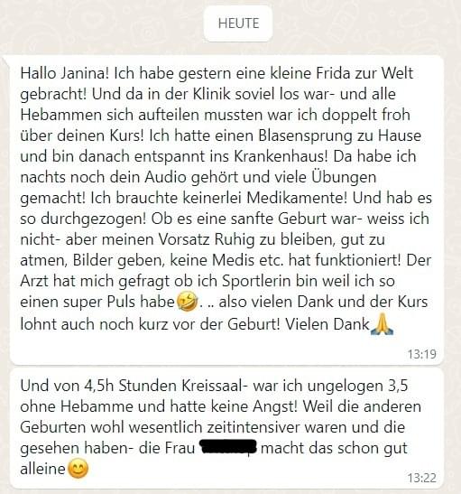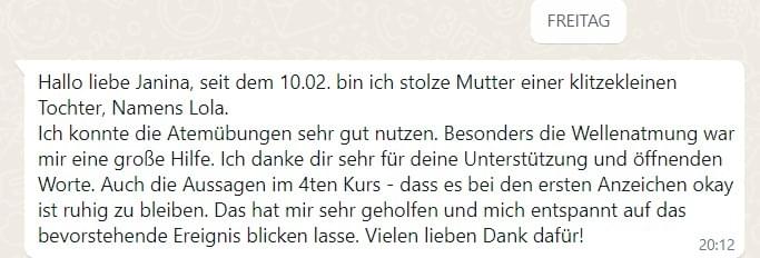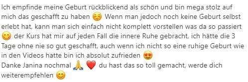 Liebe Janina Dank dir habe ich die Fassung bewahrt und mich entspannt... ich würde auch behaupten das aufgrund des Zustandes die Geburt deshalb so schnell verlief. Ich bin Dankbar das ich diesen Kurs mit dir gemacht habe. Er hat mir soviel Angst genommen.