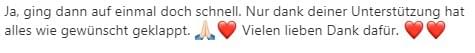 Darauf melde ich mich innerhalb von 24 Stunden bei dir per Whats App oder Telegram. Wir können telefonieren, schreiben oder per Sprachnachricht sprechen. Das darfst du wählen.